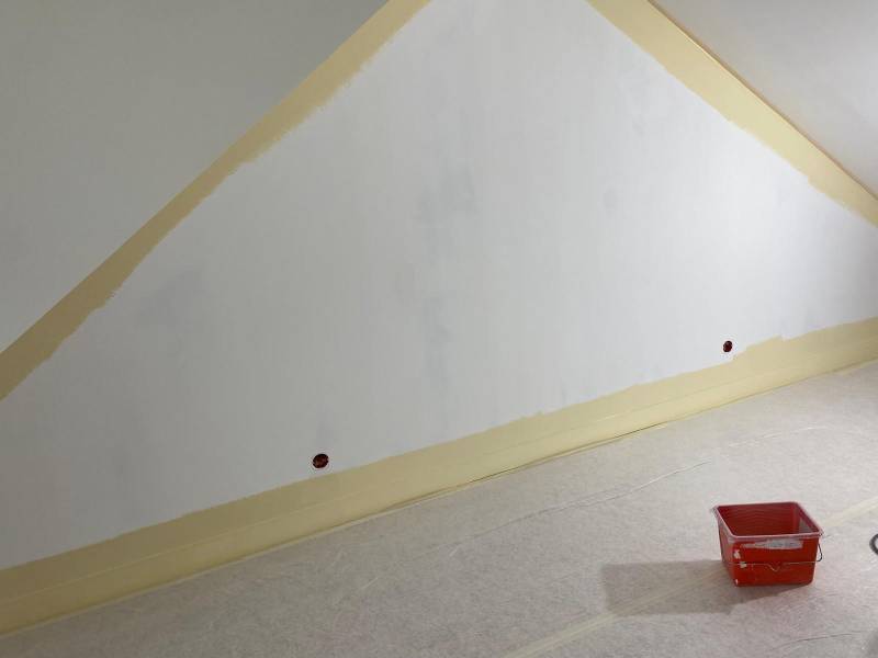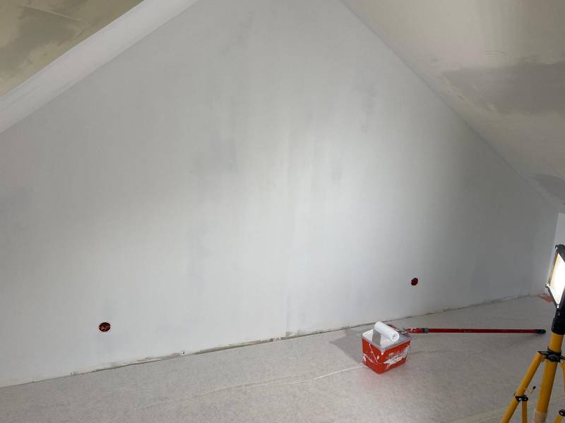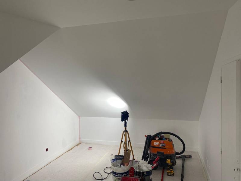 Le plafond cathédrale de cette chambre nécessitait une isolation complémentaire pour améliorer le confort thermique de l'étage, et limiter la déperdition de chaleur par la toiture. Nous avons donc entamé la pose de la laine de verre, puis effectué les travaux de plaquisterie pour recouvrir l'isolant. La forme particulière de ce plafond a nécessité de nombreuses découpes de rails et de placo pour un rendu uniforme, et pour conserver le charme de la pièce. Nous avons ensuite enduit l'intégralité des murs et plafonds, avec un ratissage précis pour une surface lisse prête à recevoir la peinture. Notre client a opté pour 2 teintes de peintures : du blanc et du beige pour le mur accueillant la tête de lit.