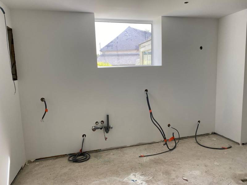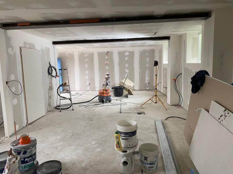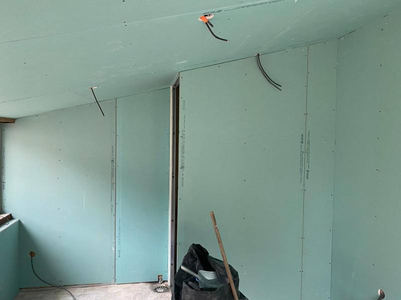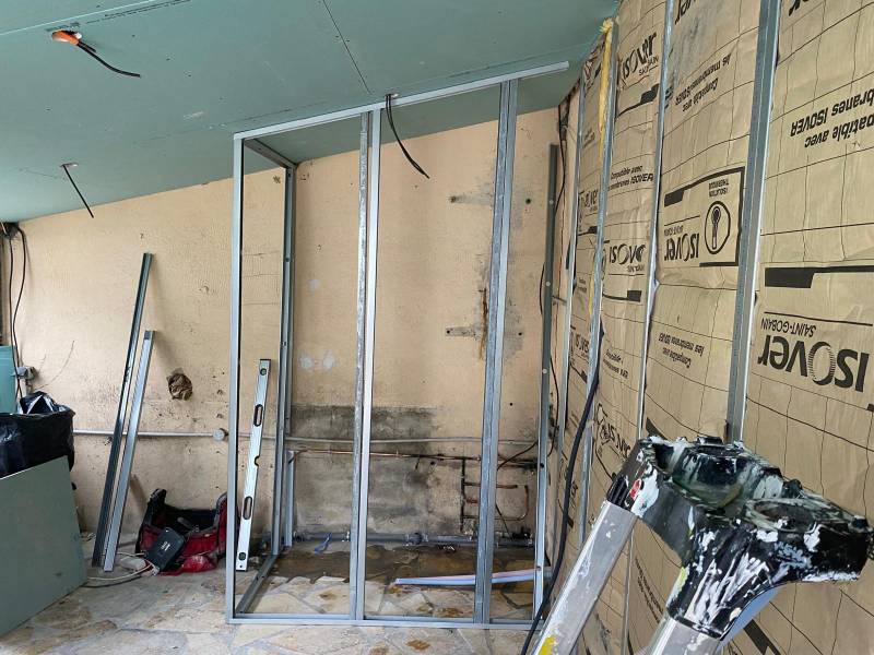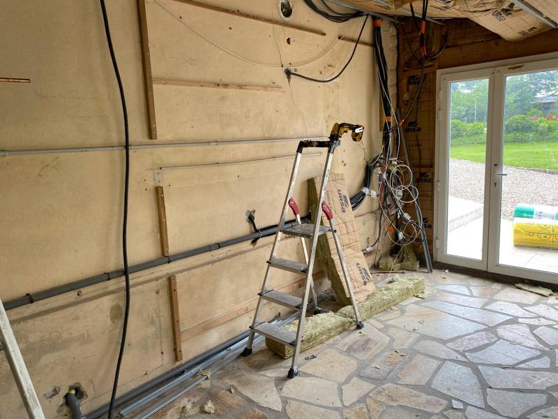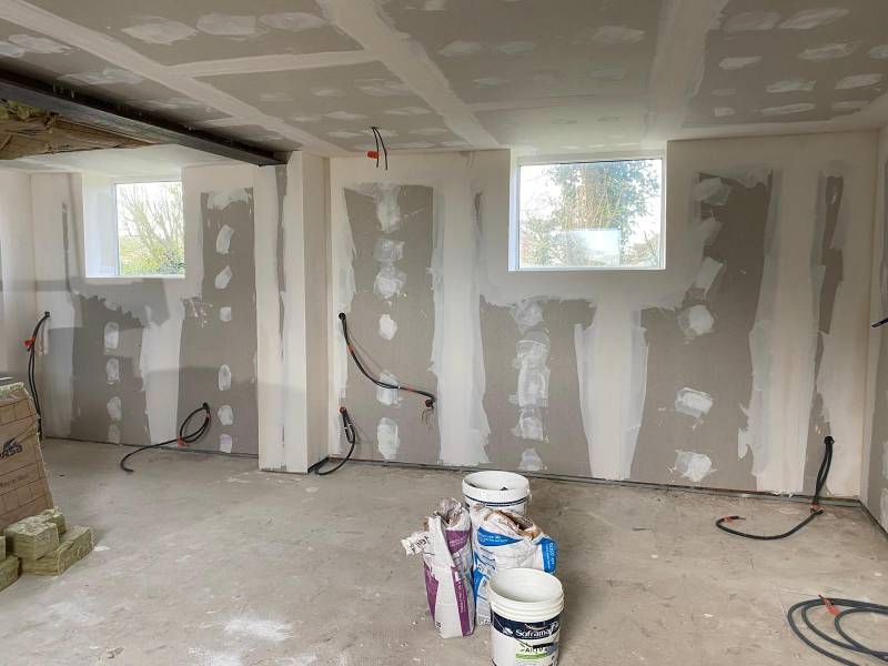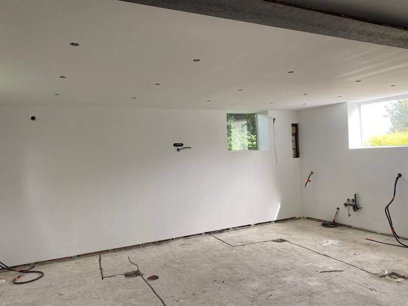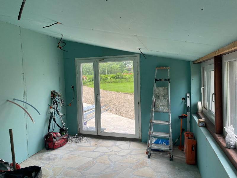 Toutes les pièces du gîte ont été habillées de nouvelles plaques de plâtres, offrant des surfaces lisses et prêtes à être enduites et peintes. Pour la salle de bain, du placo hydrofuge BA13 a été posé, assurant une meilleure résistance à l'humidité dans cette pièce sensible. Ce choix garantit une protection efficace contre les infiltrations d’eau.