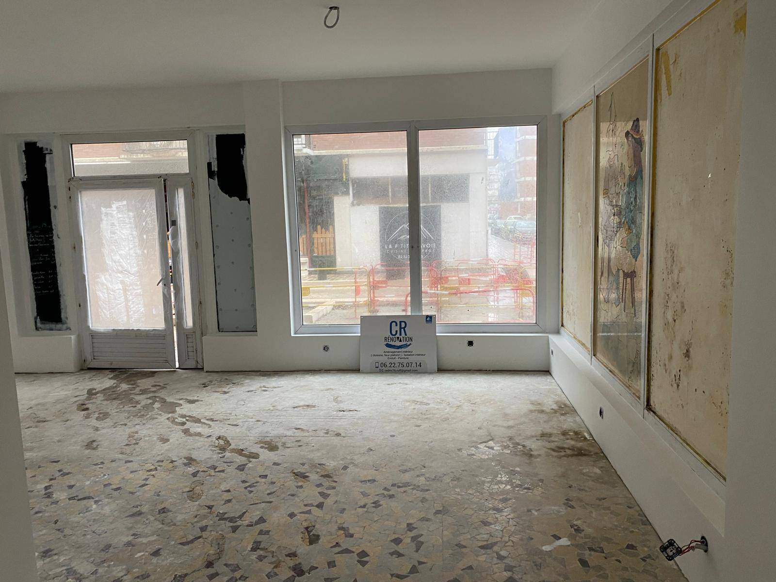 CR Rénovation réalise la rénovation intérieure de commerces au Havre quartier Saint-Vincent : faux plafond, enduit et peinture blanche. Devis gratuit.